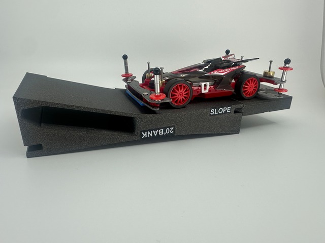 30°バンク&1Pスロープチェッカー スパークリーブラックなります。 20°バンク&スロープと同じ全長幅で制作しておりますのでタミヤピットボックスにも収納が可能です。